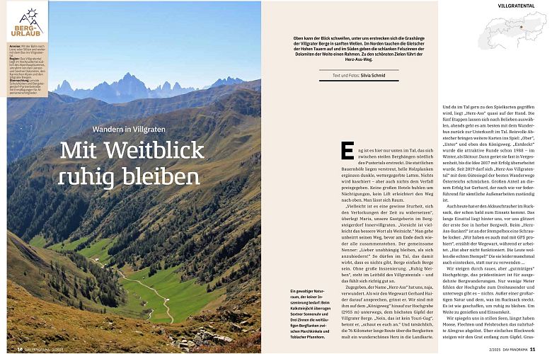 Im Magazin 02/2025 des Deutschen Alpenvereins berichtet Silvia Schmid über ihre Wanderungen im Villgratental. Man spürt im Text: Sie war da, sie hat alles selbst erlebt.